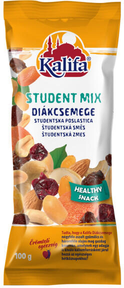 Tudta, hogy a Kalifa Diákcsemege négy féle aszalt gyümölcs és háromféle olajos mag gazdag keveréke, amelynek egy adagja is kiváló káliumforrásként járul hozzá az egészséges hétköznapokhoz? Vásárlóink igényeit figyelembe véve megalkottuk az ÚJ összetételű diákcsemegénket, amely méginkább egyesíti a ropogós magvak és ínycsiklandó aszalványok finoman változatos keverékét! Ideális nassolni való tízóraira vagy uzsonnára, de a reggeli zabkásánkat is gazdagíthatjuk vele! Összetevők: mazsola, napraforgó olaj, gyapotmag olaj, pörkölt földimogyoróbél, növényi olaj, napraforgó, pálma, repce, magozott aszalt sárgabarack, antioxidáns, E220 - Kén-dioxid, kesudióbél, törökmogyoróbél, mandulabél, cukrozott aszalt vörösáfonya, napraforgó olaj